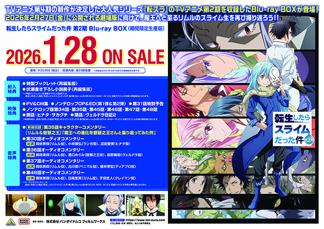 このたび、TVアニメ第2期(2021年1月~9月放送)本編全24話を収録した『転生したらスライムだった件第2期』 Blu-ray BOXが2026年1月28日に発売決定いたしました。