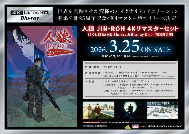 関連記事:原作・脚本:押井守×監督:沖浦啓之!劇場公開25周年記念『人狼 JIN-ROH』4Kリマスター & Dolby Atmos化決定!4Kリマスターセット(4K UHD BD & BD 2枚組) 2026年3月25日発売!4Kリマスター映像・Dolby Atmos音響にて 2026年3月6日よりリバイバル上映