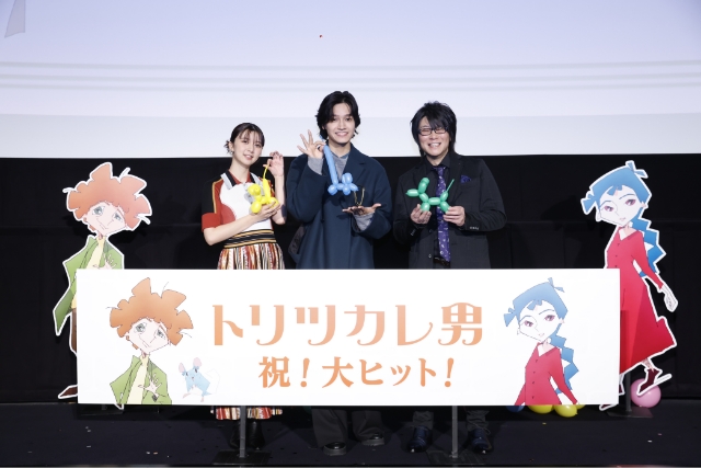 さらに、劇中で印象的に映し出されるバルーンを使って、ジュゼッペの相棒であるハツカネズミのシエロをイメージしたねずみのアートバルーンを登壇者が作る展開に。慣れないアートバルーンに苦戦する佐野をはじめとした一同に、客席からは温かい応援の声が上がる。順調に完成させた森川、上白石に続き、一足遅れて無事完成させた佐野だが、しっぽが異常に長いそのユニークなバルーンの出来栄えを見て、満足そうな表情を見せた。また続けて、本作の公開記念として、ステージ上にスパークバルーンが登場!(※スパークバルーン=大きな風船の中にいくつもの小さな風船が入ったくすだまのようなもの) 大きなバルーンを目の前にして驚きの表情を見せる一同だが、「『トリツカレ男』最高!」のかけ声に合わせ、佐野がバルーンを勢いよく割ると、会場からも歓声と大きな拍手が起こり、佐野らも「綺麗~!」と感動の表情を見せた。