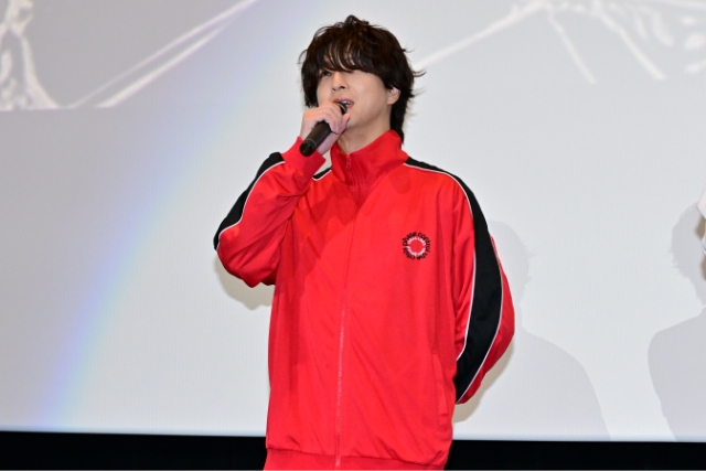 謎の天才起業家・架神傑の声を務めた寺西は、赤ジャージでキャラクターを完全再現。「僕の場合はコラボというか…ほぼ傑」と言いながら、目元を隠した前髪に触れて「前が見えづらい…」と困惑気味ながらも、完成度の高い出来上がりに会場からは喜びの声が上がる。栞のクラスメイト山田健斗の声を担当した齋藤は、制服&前髪アップのセンター分けで「僕はいつもよりも視界が広いです!」と新鮮な面持ち。声優陣のなりきり姿に河森監督は「昨日横浜でイベントをやったので、その時にこのままの姿で歩いてほしかった!それくらい再現度が高い!」と太鼓判を押していた。