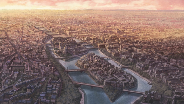 映画の中で描かれるのは【百年前のパリの街】。今でもヨーロッパには、石造の建築が並ぶ統一感のある街並み、歴史を感じられる風景が残っているとはいえ、100年前の風景のリアリティを持って描くことは困難を極めていた。実際にパリでロケハンを行い、リサーチャーの白土晴一を中心に、当時の街並みはもちろん、文化や人々の生活にまで調査を重ねたという。谷口監督は「調べられる限りのことは調べましたが、フランスにも資料が残っておらず、わからなかったこともあります。ただこの作品は、現代の観客が100年前のパリにリアリティ、もっともらしさを感じていただくところが一番大事なところです。だから調べたものをそのままは描いていないところもあります。意図的に」と明かし、「例をあげると、当時のパリの街はリアルに描いたら、そんなにきれいな街ではなくなります。でもふたりがパリになにを見ているのかを伝えようと思ったら、きれいに見えたほうがいいんです。二人の感情というフィルターを通してのパリを表現する」と街の描き方について振り返っていた。また、「一方で、ティザーポスターでフジコが上体を乗り出している屋根裏の部屋、窓の隣にかまぼこ型の突起が描かれています。あれはあの部屋がもともと鳩を飼っていた鳩小屋だったからです。これはフジコの生活を地に足がついたものに見せるために必要なデティールですから描くわけです」と谷口悟朗監督は語る。