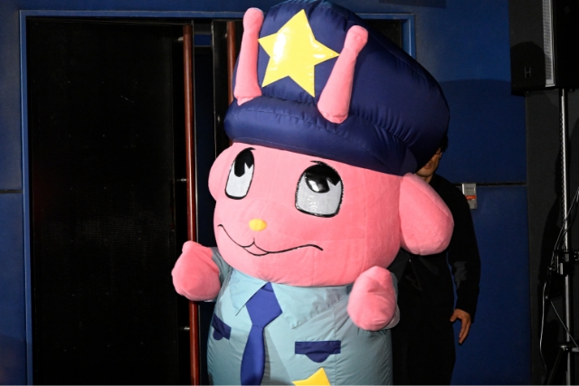 映画上映直後の熱気冷めやらぬ会場に、劇中でもインパクト抜群の登場で脳裏に焼きつく人気キャラクターのポッピーくんが、『ミルキー☆サブウェイ』劇場公開を祝福すべく駆けつけ、愛嬌たっぷりのファンサービスで幕開けした舞台挨拶。和やかな雰囲気のなか、寺澤、小松、小野、ロバートがポッピーくんとハイタッチもしながら登壇し、熱い拍手で迎えられた。ただ、一緒に出て来るはずの亀山監督の姿が見えない?とザワつき始めると、ずっと会場を盛り上げてくれていたポッピーくんの様子がおかしい・・・? 会場中の注目を一身に浴びるなか、なんとポッピーくんの中から亀山監督が登場するまさかの”銀河級サプライズ”に騒然!!このまさかまさかの展開、なんと亀山監督の発案でポッピーくんに扮していたそうで「『せっかくだし着ぐるみが出てくれたら嬉しいよね、僕がそこから出てきたら面白くないですか??』って軽口してたら、本当にやることになってました(笑) 想像以上にしんどくて太ももパンパンです。皆さんありがとうございます」とまんざらでもない様子で挨拶し、会場はどよめき収まらぬままに笑いと拍手で包まれた。