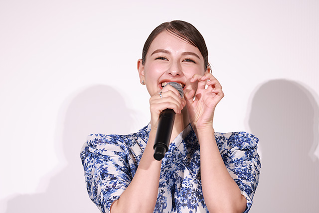 登壇時にひときわ目を引いた、キャラクターイメージでスタイリングされた声優キャスト陣の衣装。當真は「ポスターのフジコと全く同じ黄色」のワンピース、嵐は「千鶴イメージの青と白のワンピース」に「バレエの練習着と同じ色のネイル」、そして「バレエを意識した髪型」と、キャラクター要素を反映した華やかな装いのポイントを説明。松也は若林をイメージした白のスーツで、普段はめったにしない上下白の装いのため、監督からも驚かれたエピソードを披露した。そして、角田は演じたエンゾをイメージしたパンツを着用し、名塚もそれにならい、ジャンヌのイメージカラーを意識したというワインレッドのロングスカートについて触れて、役に合わせた衣装で揃って登壇した喜びをそれぞれ語った。