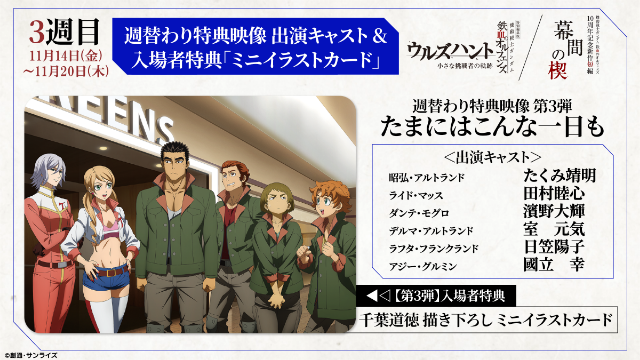 上映から3週目がスタートした本作ではこの度、本編上映前に流れる新たな「週替わり特典映像」の出演キャラクター、そして、この映像用にキャラクターデザイン・千葉道徳さんが描き下ろしたスペシャルイラストを使用した「ミニイラストカード」第3弾の絵柄を公開。さらに、特別編集版『ウルズハント』、新作短編「幕間(まくあい)の楔(くさび)」、そして「幕間(まくあい)の楔(くさび)」エンディングから場面カットを初公開いたします。