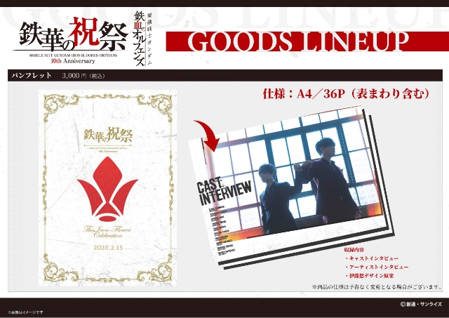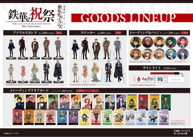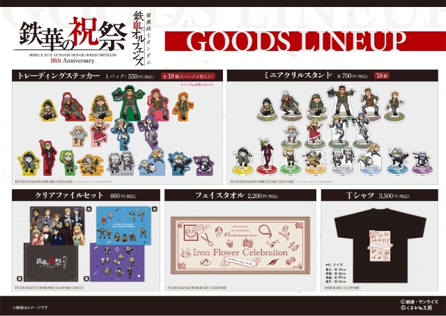 イベントパンフレットは、三日月・オーガス役の河西健吾さんとオルガ・イツカ役の細谷佳正さんの撮り下ろしフォトと共に、本イベント出演者総勢10名のキャストインタビュー、さらに横山克さん、SPYAIRのMOMIKENさんとYOSUKEさんのアーティストインタビュー、イベントキービジュアルの各キャラクターの装いの原案となった、伊藤悠さんによるデザイン原案等を掲載した36ページに及ぶ豪華内容!さらに、キャラクターデザイン・千葉道徳さんによるイベント描き下ろしイラストを使用したグッズの他、ムジーナ、電話猫や仕事猫等で著名なイラストレーター、くまみねさんと『鉄血のオルフェンズ』のコラボが実現し、くまみねさん描き下ろしのディフォルメイラストや仕事猫コラボイラストを使用したグッズも登場!この機会をぜひお見逃しなく。