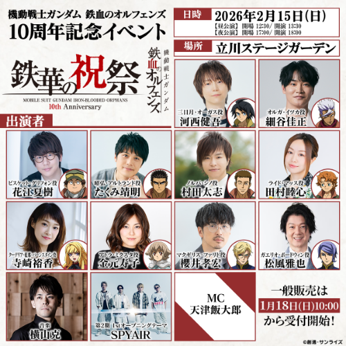 この度、2026年2月15日(日)に立川ステージガーデンにて開催される、『鉄血のオルフェンズ』10周年記念プロジェクトのフィナーレを飾るスペシャルイベント「機動戦士ガンダム 鉄血のオルフェンズ 10周年記念イベント -鉄華の祝祭-」の物販情報が本日初公開。また、展示やキッチンカーの出店も決定しました。