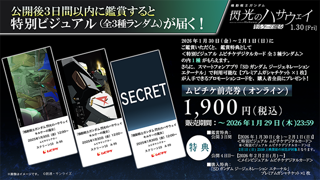 さらに、ムビチケ前売券(オンライン購入特典としてスマートフォンアプリ「SDガンダム ジージェネレーション エターナル」で利用可能な【プレミアムガシャチケット×1枚】が入手できるプロモーションコードを全員にプレゼント。