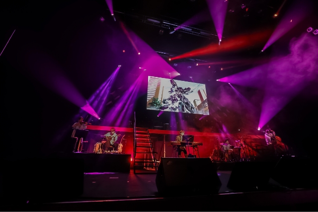 オリジナル朗読劇を終えた後は、横山さんとバンドによる劇伴生ライブ。横山さんのピアノの旋律をメインに、パーカッション、ヴァイオリン、ギター、ベースが重なるエモーショナルなサウンドは圧巻。「Crescent Moon」や「My Own Way」など、TVシリーズの劇伴7曲がメドレーで披露された。ステージ後方のスクリーンには本編映像が流され、会場は『鉄血のオルフェンズ』の世界へと引き込まれた。