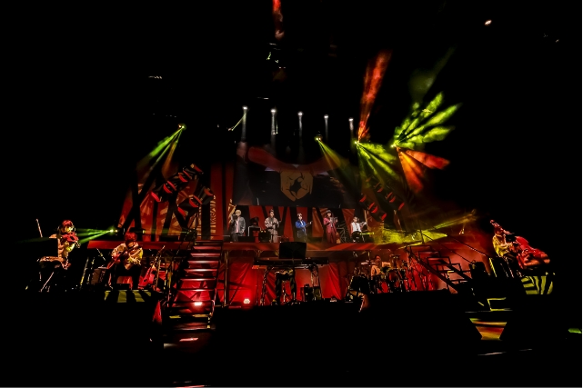 鉄華団を象徴する赤色のサインライトで来場者が出迎える中、音楽・横山克さんを中心としたバンドがテーマソング「Mobile Suit Gundam: Iron-Blooded Orphans」を演奏。本日出演するキャスト陣がドレスアップした姿で登場し、一礼したあと、イベントは開幕した。