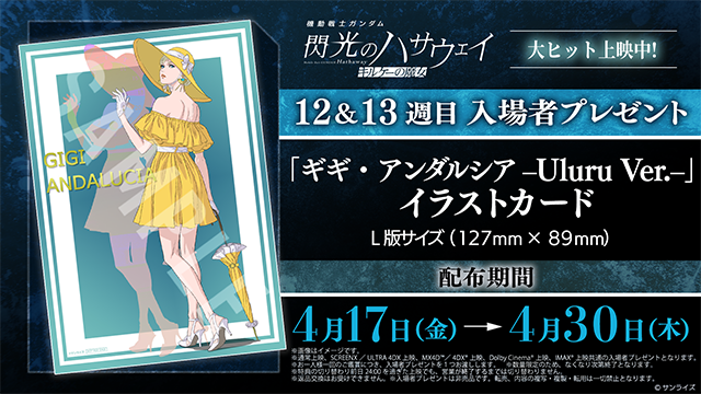公開12週目となる4月17日(金)より、12&13週目入場者プレゼントとして、本作のラストシーンでも印象的な黄色のワンピースを纏ったギギのイラストカード「ギギ・アンダルシア –Uluru Ver.–」の配布を開始します。
