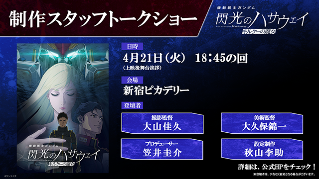 また、4月21日(火)に、撮影監督の大山佳久さん、美術監督の大久保錦一さん、プロデューサーの笠井圭介さん、設定制作の秋山李助さんの計4名が登壇する『機動戦士ガンダム 閃光のハサウェイ キルケーの魔女』のスタッフトークショーの実施が決定となりました。