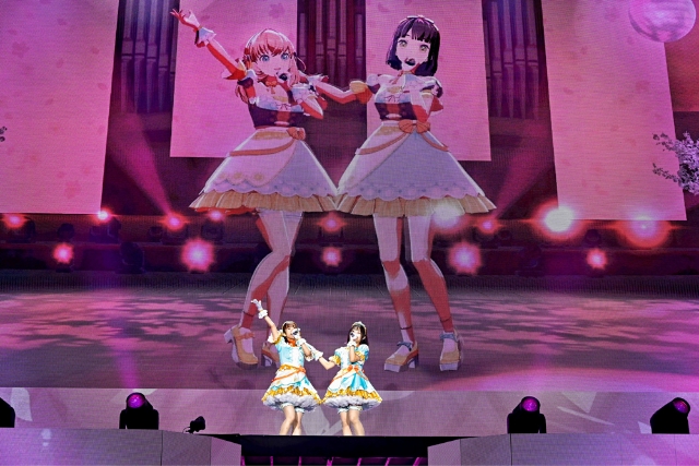 さっそく始まった1曲目は、日野下花帆&百生吟子のユニット・スリーズブーケによる、さわやかでキュートなラブソング「フルーツパンチ」。続く村野さやか&徒町小鈴のユニット・DOLLCHESTRAの「太陽であれ!」は、小鈴のポジティブさが前面に出た楽曲で、曲の中盤には客席にクラップを促しつつ、キレあるダンスで会場を盛り上げた。3曲目は、子猫がじゃれているようなパフォーマンスが印象的な、大沢瑠璃乃&安養寺姫芽のユニット・みらくらぱーく!の「ニャオシグニャル」。続いてセラス 柳田 リリエンフェルト&桂城 泉のユニット・Edel Noteによる、ドラマティックな「片翼のトリバガ」が披露された。そして最後の5曲目は、地元・金沢の伝統を伝えたい吟子の想いが込められた完全初公開の新曲「一生(ひとよ)に夢が咲くように」を8人全員でパフォーマンス。バックモニターに映る花畑やメンバー達が“立つ”スクリーンには、『リンクラ』内で開催されたユーザー参加型イベントによって贈られた“ジュエルフラワー”で彩られ、壮大な曲調と幻想的な雰囲気に圧巻された。