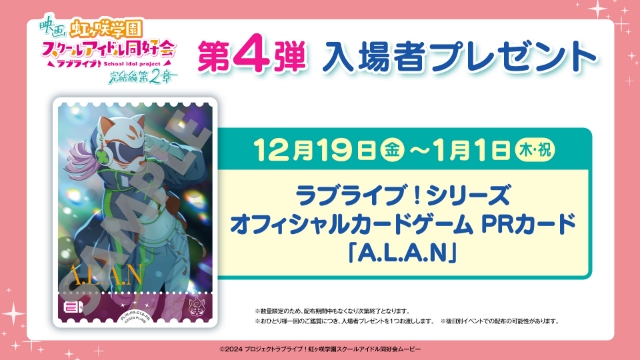 公開7~8週目に配布される第4弾入場者プレゼントは、「ラブライブ!シリーズ オフィシャルカードゲーム PRカード「A.L.A.N」」です。数量限定のため、なくなり次第終了となります。ぜひ、劇場でゲットしてください!