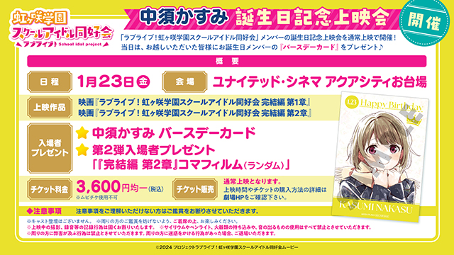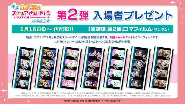また、ユナイテッド・シネマ アクアシティお台場でのロングラン上映を記念して、公開3~4週目に配布した、第2弾入場者プレゼント「『完結編 第2章』コマフィルム(ランダム)」が、1月16日(金)より再配布されます。さらに、同劇場にて、1月23日(金)に中須かすみ誕生日記念上映会が決定しました。