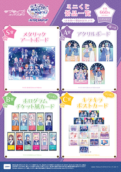 本イベントでは、『ラブライブ!スーパースター!!』に登場するスクールアイドル・Liella!のライブ「ラブライブ!スーパースター!! Liella! 7th LoveLive! 〜Fly! MUSIC WORLD♪〜」のアフターパーティというコンセプトのもと、デニム衣装で着飾った11 人を新規描き下ろしイラストを使用した新商品の販売やパネル展示が行われます。また、会場で商品をご購入いただいたお客様には、ご購入金額3,000 円(税込)ごとに「ランダムステッカー」(全16 種)をランダムで1 枚プレゼントいたします。その他、7th ライブ含め作品に関連する展示コーナーも設置予定です。