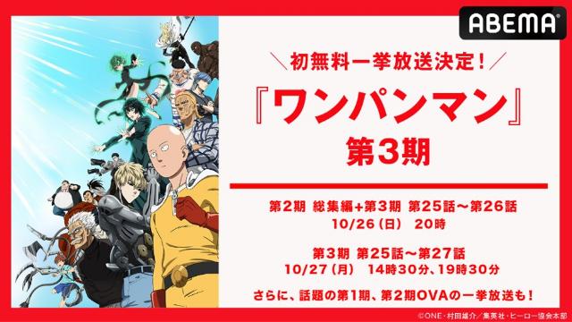 「ABEMA」にて『ワンパンマン』第3期最新話までの振り返り一挙放送と第1期・第2期OVA全話一挙放送が決定!