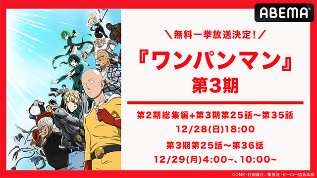 また、「ABEMA ビデオ」にてアニメ『ワンパンマン』第2期総集編及び第3期第1話(#25)〜第11話(#35)までの無料視聴が可能となります!こちらもぜひお見逃しなく!