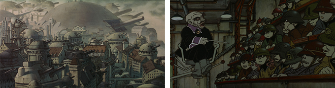 舞台は壁に囲まれたクラシカルな城塞都市で、全市民が果てしなき砲弾戦を続けていることが描かれる。蒸気機関と火薬を中心とした世界観の点で『スチームボーイ』の前哨戦的なポジションでもある。映像は、とある労働階級の家庭から少年が目ざめる場面からスタートする。ところが画面はそのまま少年を追い、居間の朝食から父親と少年が家を出る出勤・登校へとシームレスに推移していく。