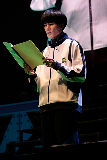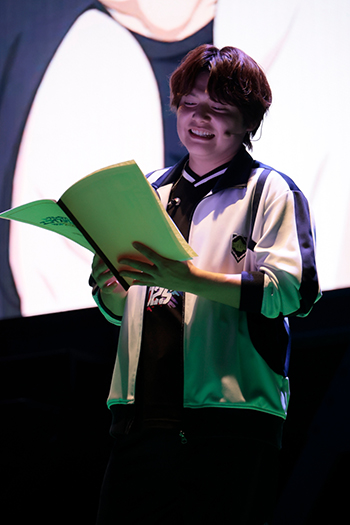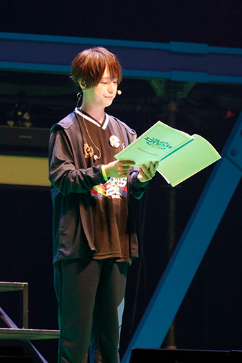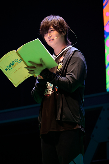 デイゲームも後半戦に突入し、『ブルーロック』にまつわるお宝を見せて、凡か非凡かを判定する「凡でも鑑定団!」のコーナーへ。凡か非凡かは、観客が振るペンライトの多さによって最終的に判定されるとのこと。最初に登場したのは、三上さんが持ってきたTVアニメ第2期の台本。『ブルーロック VS. U-20 JAPAN』が初のアニメレギュラー作品である三上さんは台本すべてがお宝だといい、とくに持参した話数の台本は「剥き出しにするだけがエゴじゃないで」という氷織のセリフについて悩みに悩んだこともあって、とくに思い入れが強いと語った。該当ページにはびっしりと細かく書き込みがされており、客席だけでなくキャスト陣からもすごいと感心する声があがった。「“エゴじゃないで”のセリフを、氷織くんのキャラから外れるくらい低くしてくださいとディレクションをいただいて、そこに苦戦しましたね」と収録を振り返った後、先輩たちからの無茶ぶりに応えてそのセリフを再現。大きな拍手が起こり、客席による判定はもちろん非凡となった。