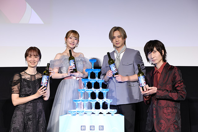 熱いトークのさなか、映画の大ヒットを祝して、“蒼海の涙編”をイメージしたブルーのシャンパンタワーが舞台上に登場。本作の主題歌であるTRUEの「ユートピア」が流れる中、4人が一斉にシャンパンを注ぐと、青く光るタワーが完成!まさに『蒼海タワー』なきらびやかな光景に、登壇者は喜びの表情を見せ、会場全体が沸き上がった。