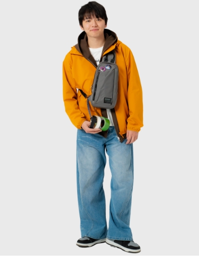 イエロー系のジャケットを基調としたやわらかなカジュアルスタイルは、控えめで優しい人柄をそのまま映し出したようなデザイン。動きやすさと実用性を兼ね備えた装いが、現場でのリアルな佇まいを感じさせます。中でも印象的なのが、バッグに付けられたヒーローの缶バッジ。さりげないワンポイントでありながら、彼にとっての“ヒーロー像”や憧れを象徴する存在となっています。