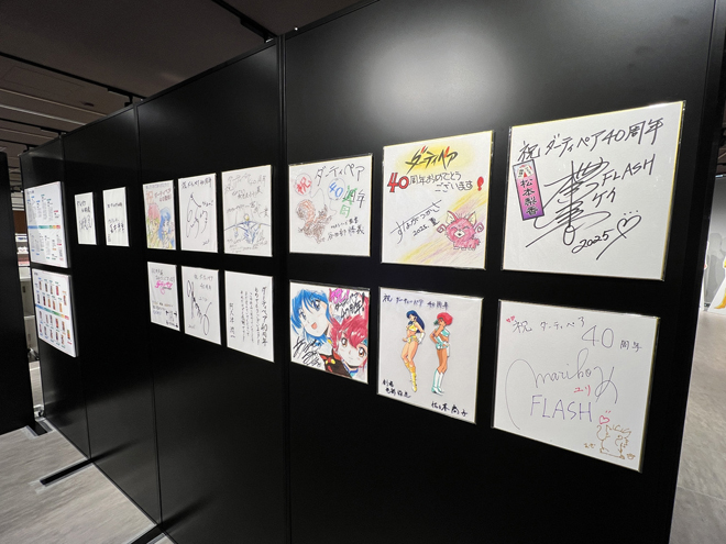 会場に入るとまず目に入るのは、導入パートとも言える原作シリーズ年表とアニメシリーズ年表、そしてキャスト&スタッフによる記念展開催をお祝いするサイン色紙。シリーズ年表で紹介される大まかな歴史を振り返りつつ、関係者による『ダーティペア』への思いを感じたら、いよいよメインの展示へ。