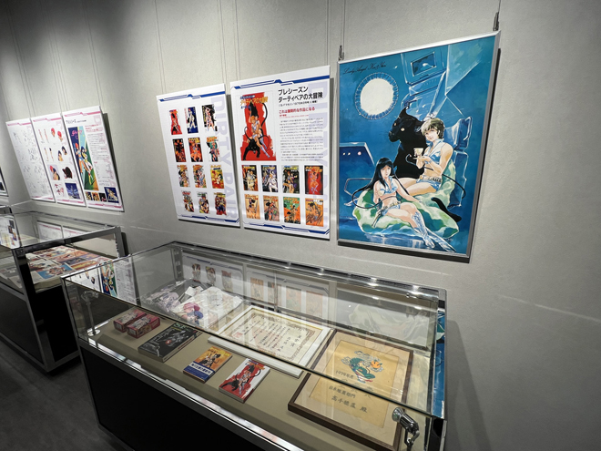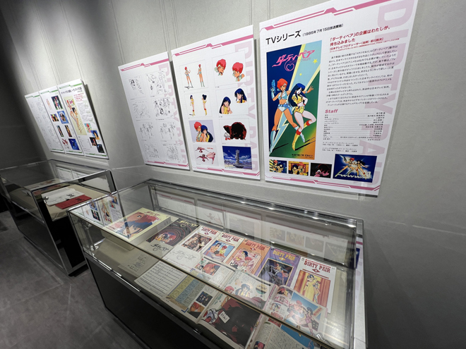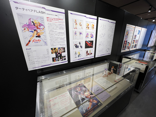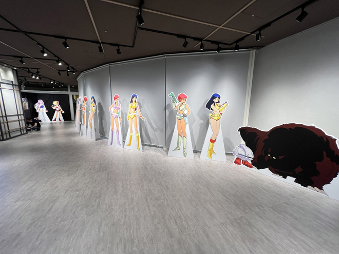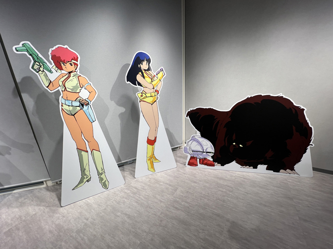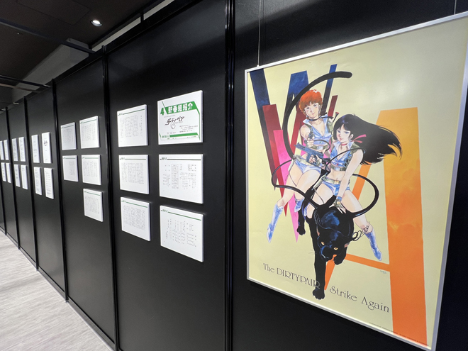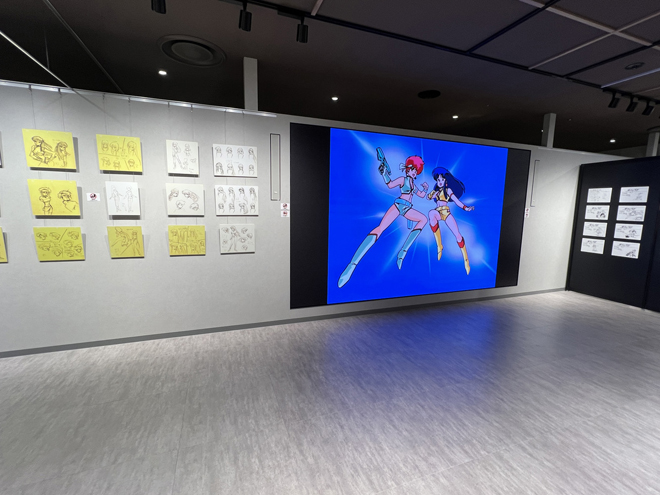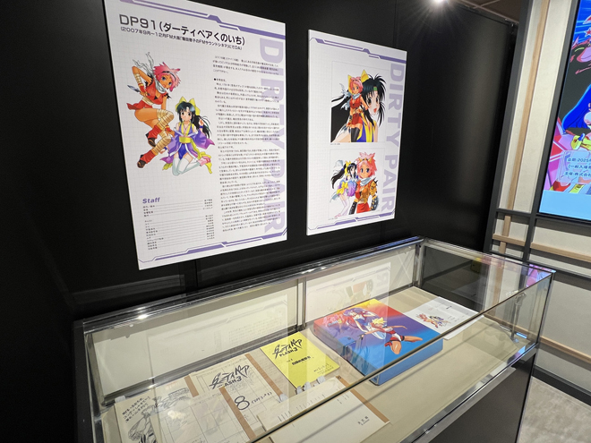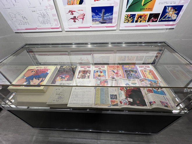 展示のラストを飾るのは一般入場時は撮影禁止となる貴重な資料が飾られたエリア。壁面には巨大モニターが設置され、『ダーティペア』のリマスターされた歴代作品のオープニングとエンディングの映像が流れている。懐かしさを感じさせる音楽、リマスターによって高精細となった映像は、大きなモニターだからこその迫力と細部の描き込みを楽しめる。