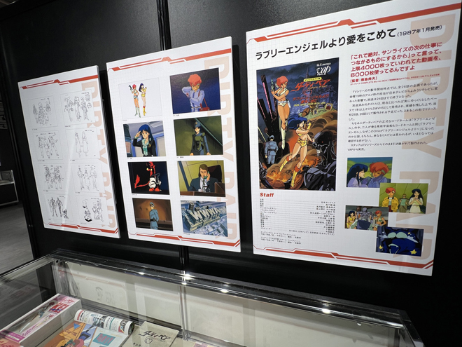 TVシリーズ、劇場版、OVAなどの各作品の解説パネルには、メインスタッフによる各作品へのひと言コメントが添えられており、各作品のテンションが伝わってくるのも嬉しい。パネルの下のガラスケースには、保存されていた絵コンテ、アフレコ台本、レーザーディスクなどのパッケージ、作品放送&上映時期などに『ダーティペア』の記事が掲載されたアニメ誌、関連グッズやフィギュアなどが置かれており、当時の雰囲気をしっかりと伝えてくれる展示になっているのが嬉しい。