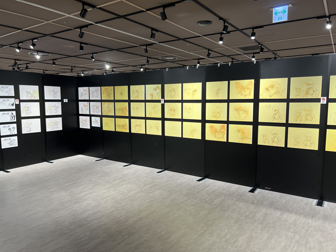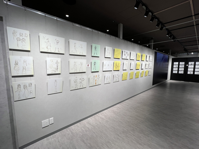 モニターの向かい側の壁面には、『ダーティペア』シリーズのキャラクターデザインと作画監督を務めた土器手司さん自らが保存していた修正原画の複製を原寸大で展示。土器手さんがこだわったキャラクターの表情や仕草などを間近で見ることができる。