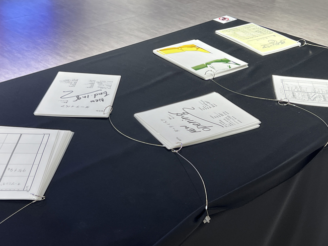 エリア入口横の壁面には、テレビシリーズ各話ごとの設定集の表紙が並ぶ。設定集の表紙は、作品に参加した原画担当者たちがもちまわりで表紙用イラストを自由に描いたもので、さまざまなおふざけも満載。まさにここでしか見ることができない、当時のスタッフの空気感が伝わるものとなっている。
