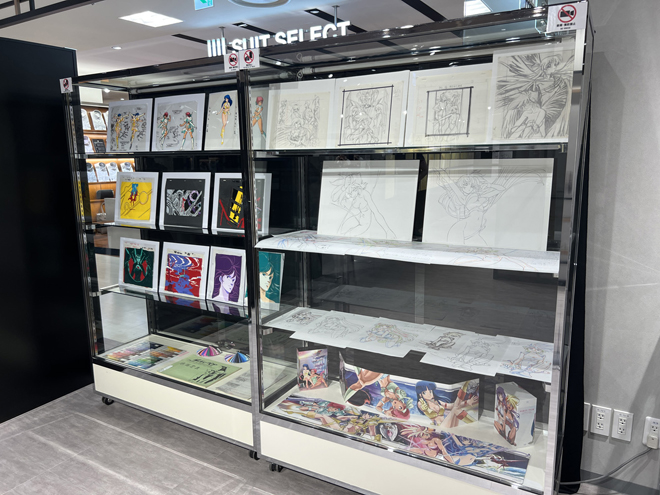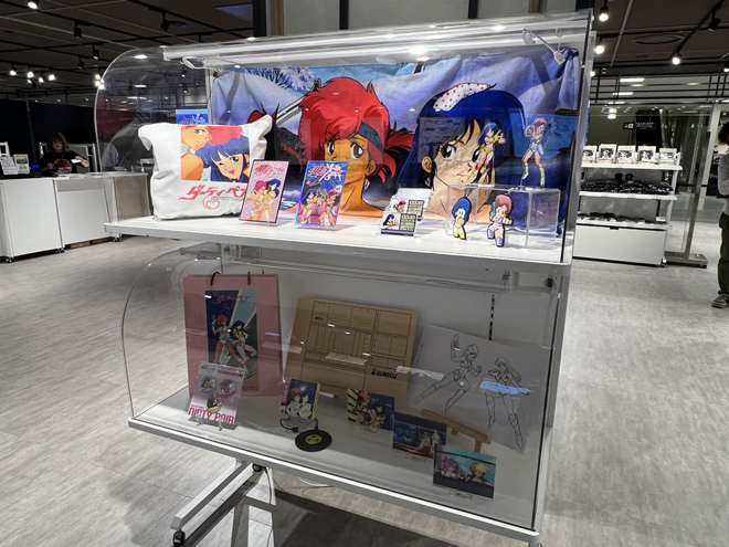 展示のラストを飾るのは一般入場時は撮影禁止となる貴重な資料が飾られたエリア。壁面には巨大モニターが設置され、『ダーティペア』のリマスターされた歴代作品のオープニングとエンディングの映像が流れている。懐かしさを感じさせる音楽、リマスターによって高精細となった映像は、大きなモニターだからこその迫力と細部の描き込みを楽しめる。
