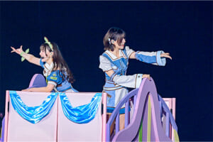 その後、伊達、岬、青山、薮島、結那の5名がトロッコに乗り、「1.2.3!」で会場を一周。観客と交流を楽しみながらパフォーマンスすると、ステージにラメ煌めく衣装姿のペイトンが登場。「Just woo!!」では、振付けにムーンウォークやチャールストンを組み込み、完成度の高いパフォーマンスを見せつけた。次に、エプロンドレス風衣装の坂倉がカードを切る仕草が印象的な「ワイルドカード」を披露。その後、ステージに寝転んだ大熊が天井に手を伸ばして始まった「LiLiA」では、幻想的なホワイトライトと表現力のある歌声で観客を圧倒した。続いて、黄色の衣装のLiyuuが「ファンダメンタル」をエモーショナルに歌い上げると、伊達、岬、ペイトン、青山が加わった「探して!Future」では、キャストが会場を縦横無尽に練り歩き、客席から沸き起こる合いの手で会場の熱気は再び急上昇。